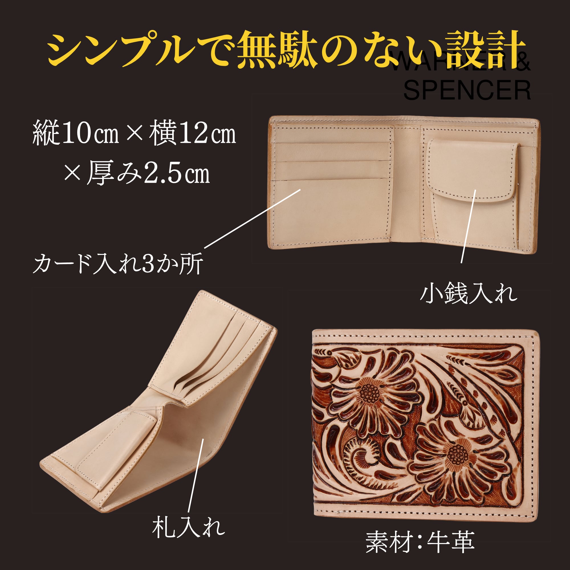 手彫り ブラウン本革財布 二つ折り ハンドメイドカービング 牛革 レザーウォレット